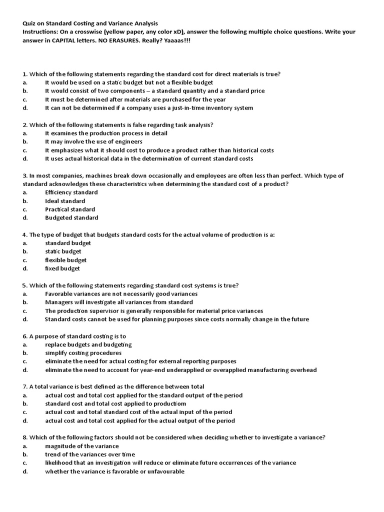 Standard deviation b productivity ratio. If costs remain within the standards Managers can focus on other issues. Which one of the following is not an advantage of a standard costing system. Criticism on Standard Costing. The use of standard costs is a key element in a management by exception approach. Fourthly a standard costing system may be used to assess the performance and efficiency of staff and management. D A key factor or principal factor does not influence the preparation of all other budgets. Assignable deviation d randomized mean. I Since Standard Costing involves high degree of technical skill it is therefore costly.
