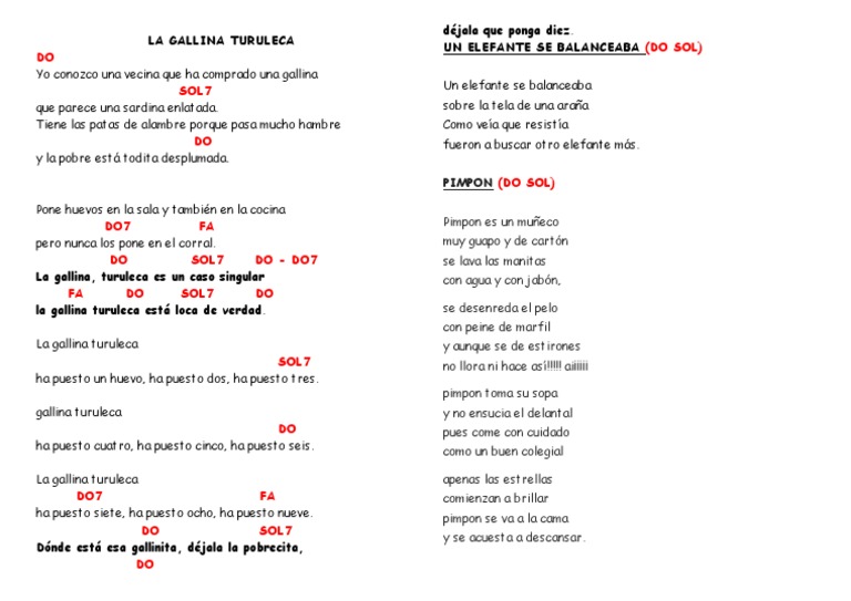 La gallina turuleca C7 F ha puesto siete ha puesto ocho ha puesto nueve. DO SOL7 DO - DO7 La gallina turuleca es un caso. Aprende esta canción y muchas mas en acordesweb. C G7 Dónde está esa gallinita déjala la pobrecita C déjala que ponga diez. Tiene las patas de alambre porque pasa mucho hambre C y la pobre está todita desplumada. Tiene las patas de alambre porque pasa mucho hambre C y la pobre está todita desplumada. Canción infantil de 3 acordes.